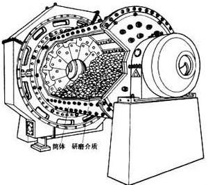 物料通過給料器進入筒體進行磨礦,筒體內(nèi)裝有各種直徑的磨礦介質(zhì)(鋼球或鋼段)。當筒體繞水平軸線以一定的轉(zhuǎn)速回轉(zhuǎn)時,裝在筒內(nèi)的介質(zhì)和原料在離心力和摩 擦力的作用下,隨著筒體達到一定高度,當它們自身的重力大于離心力時,便脫離筒體內(nèi)壁拋射下落或滾下,由于沖擊力而擊碎礦石。同時在磨礦機運轉(zhuǎn)過程中,磨 礦介質(zhì)相互間的滑動運動對原料也產(chǎn)生研磨作用。磨碎后的物料通過中空軸排出。由于不斷給入物料,其壓力促使筒內(nèi)物料由給料端向排料端移動。濕磨時,物料被 水流帶走;干磨時,物料被抽出筒外的氣流帶走。