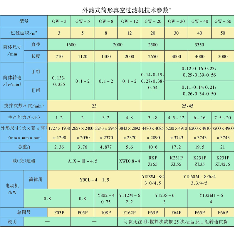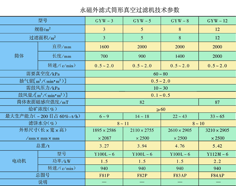 筒體內(nèi)部裝有鍶鐵氧體永久磁系,可促使磁性顆粒迅速吸附到濾布表面,磁濾機(jī)主要用于粒度較粗的強(qiáng)磁性礦物精礦礦漿的脫水,由于是上部給料,使得濾餅中精礦按粒度分層的效果更加明顯,當(dāng)磁性精礦形成濾餅時(shí),顆粒同時(shí)受到重力和磁力的作用,粗顆粒精礦比細(xì)顆粒精礦向?yàn)V布運(yùn)動(dòng)的快,精粒首先接觸濾布,故濾餅的透氣性好,而且礦漿中磁性顆粒在磁力吸引下呈放射狀布于圓筒表面,并由于磁系極性變化而產(chǎn)生磁攪動(dòng)作用,這都成為濾餅易脫水的有利條件,使得濾餅厚且透氣性好,顯著地提高了生產(chǎn)率,與同規(guī)格的筒形真空過濾機(jī)相比,其效率提高三倍以上。技術(shù)參數(shù)