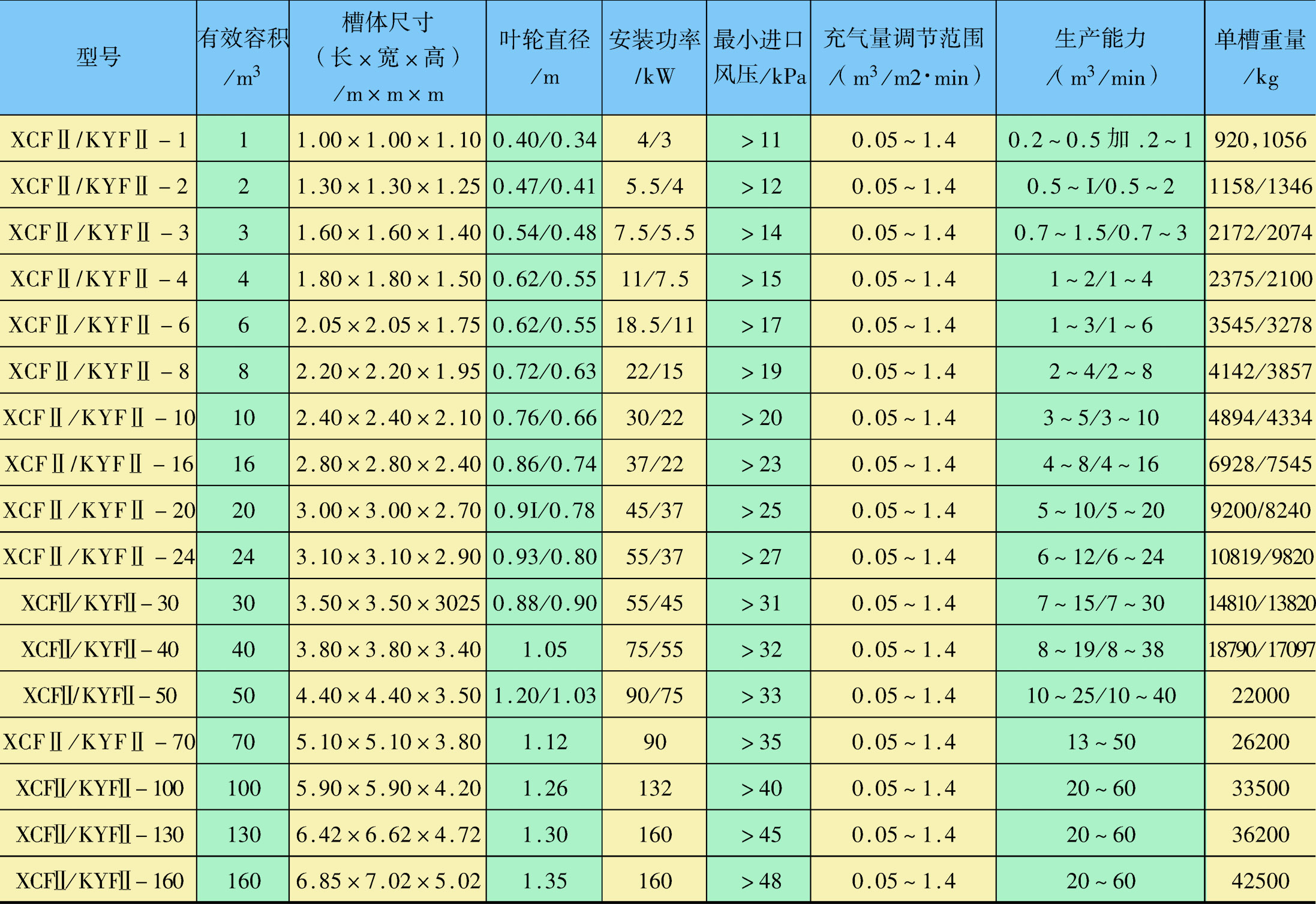 XCFII/KYFII型充氣式浮選機主要技術(shù)參數(shù)